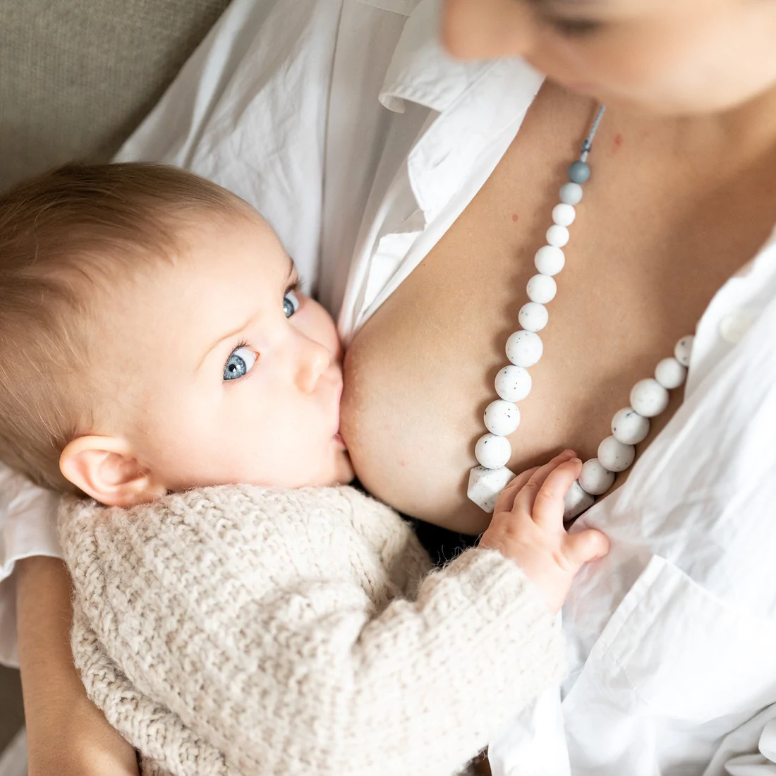 Nouveau bijou d’allaitement minéral, terrazzo granito lumineux en blanc et gris.